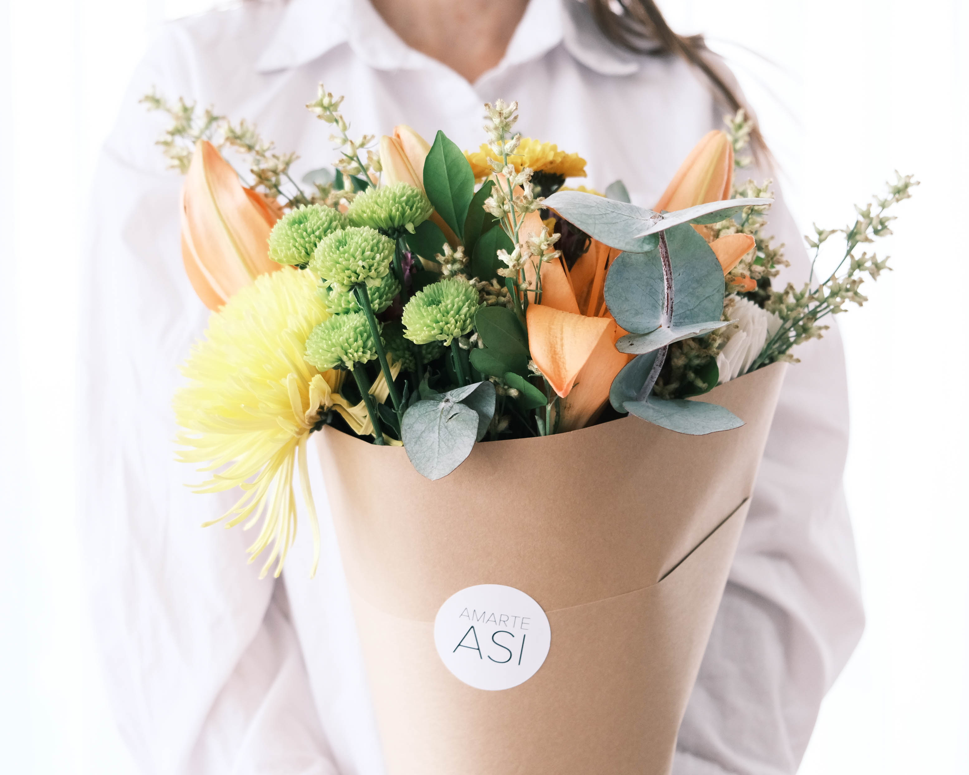 Presentado con el packaging característico de Amarte Así, acompañado de alimento floral para que tus flores se mantengan frescas y radiantes por más tiempo.