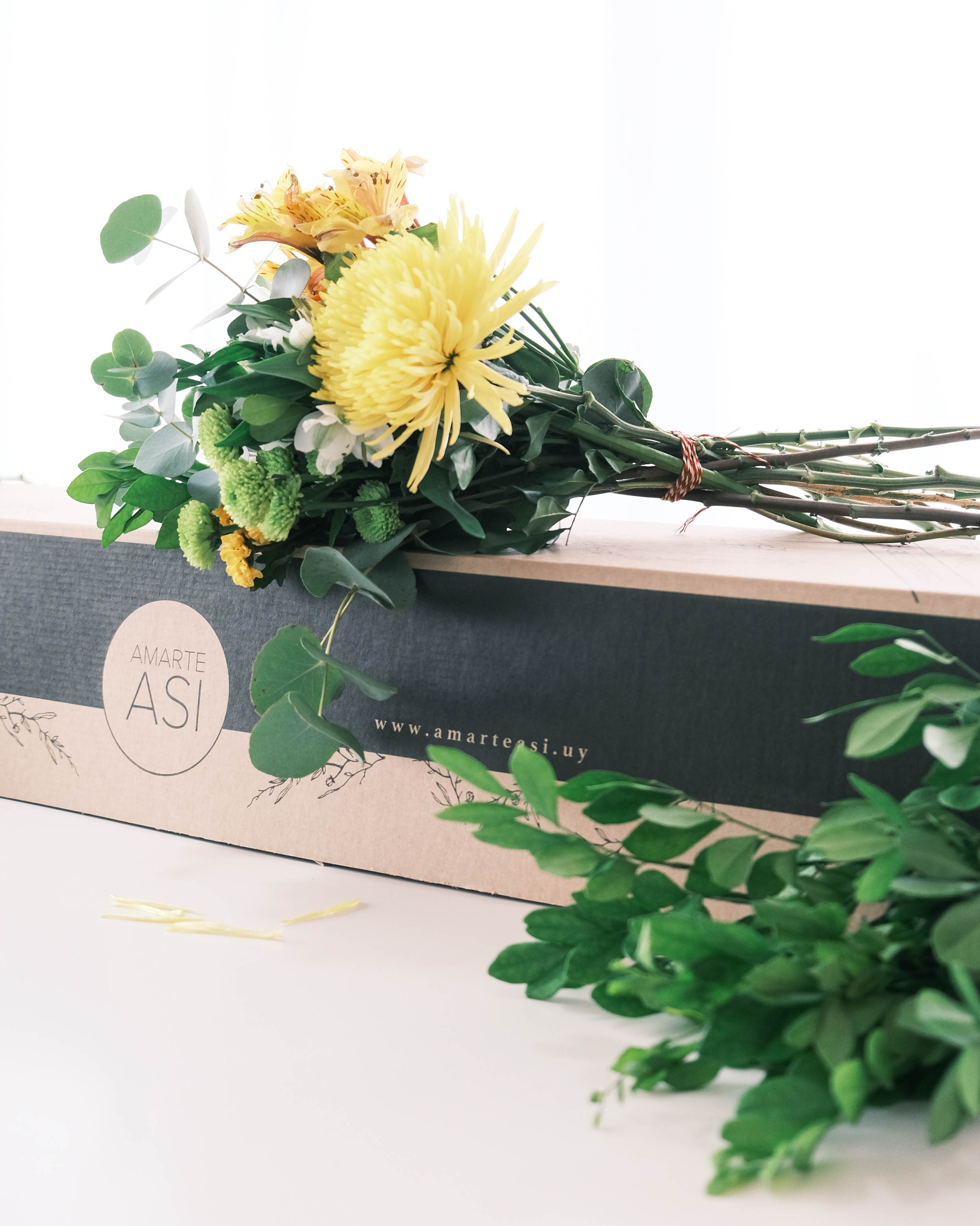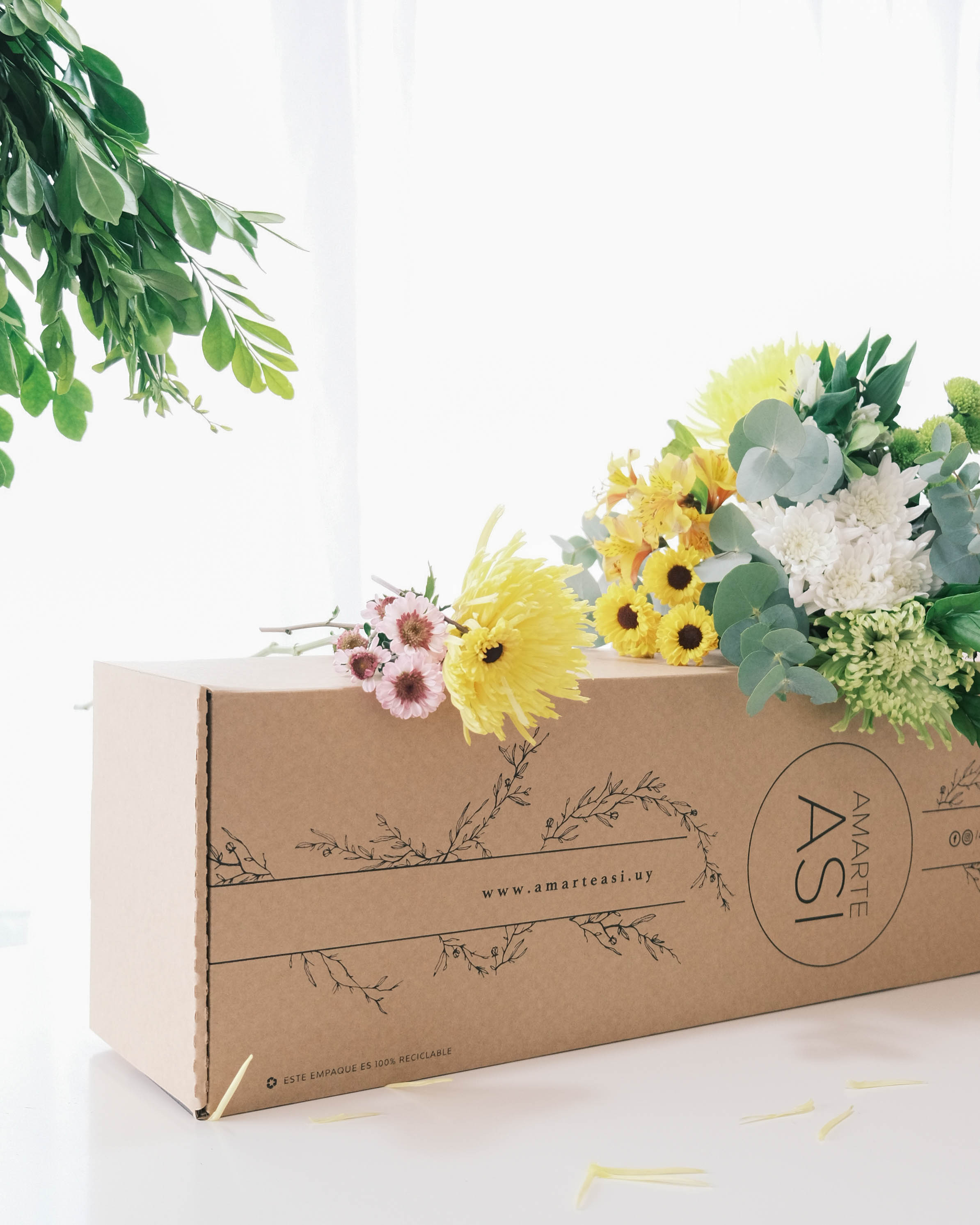 Presentado con el packaging característico de Amarte Así, acompañado de alimento floral para que tus flores se mantengan frescas y radiantes por más tiempo.